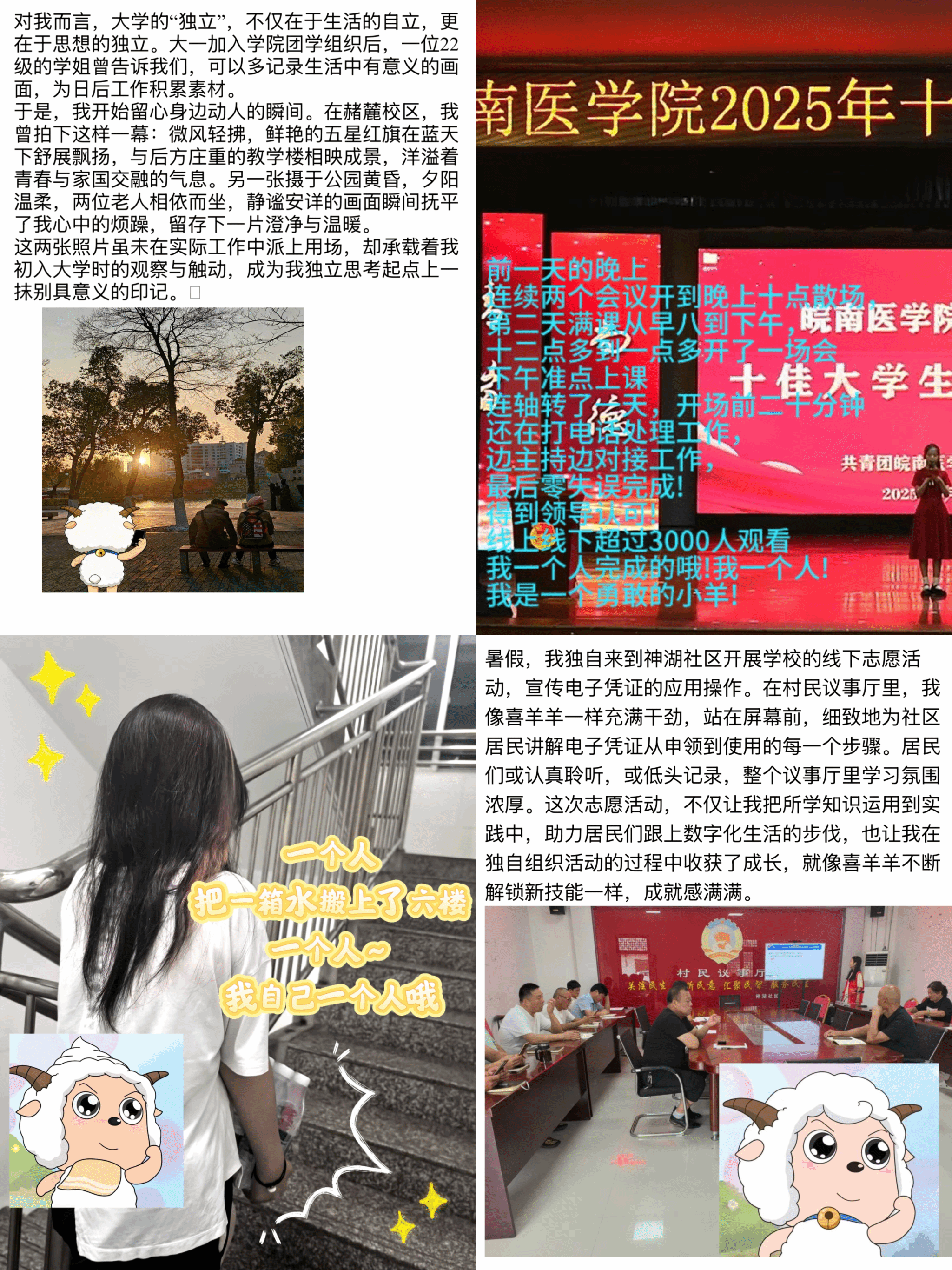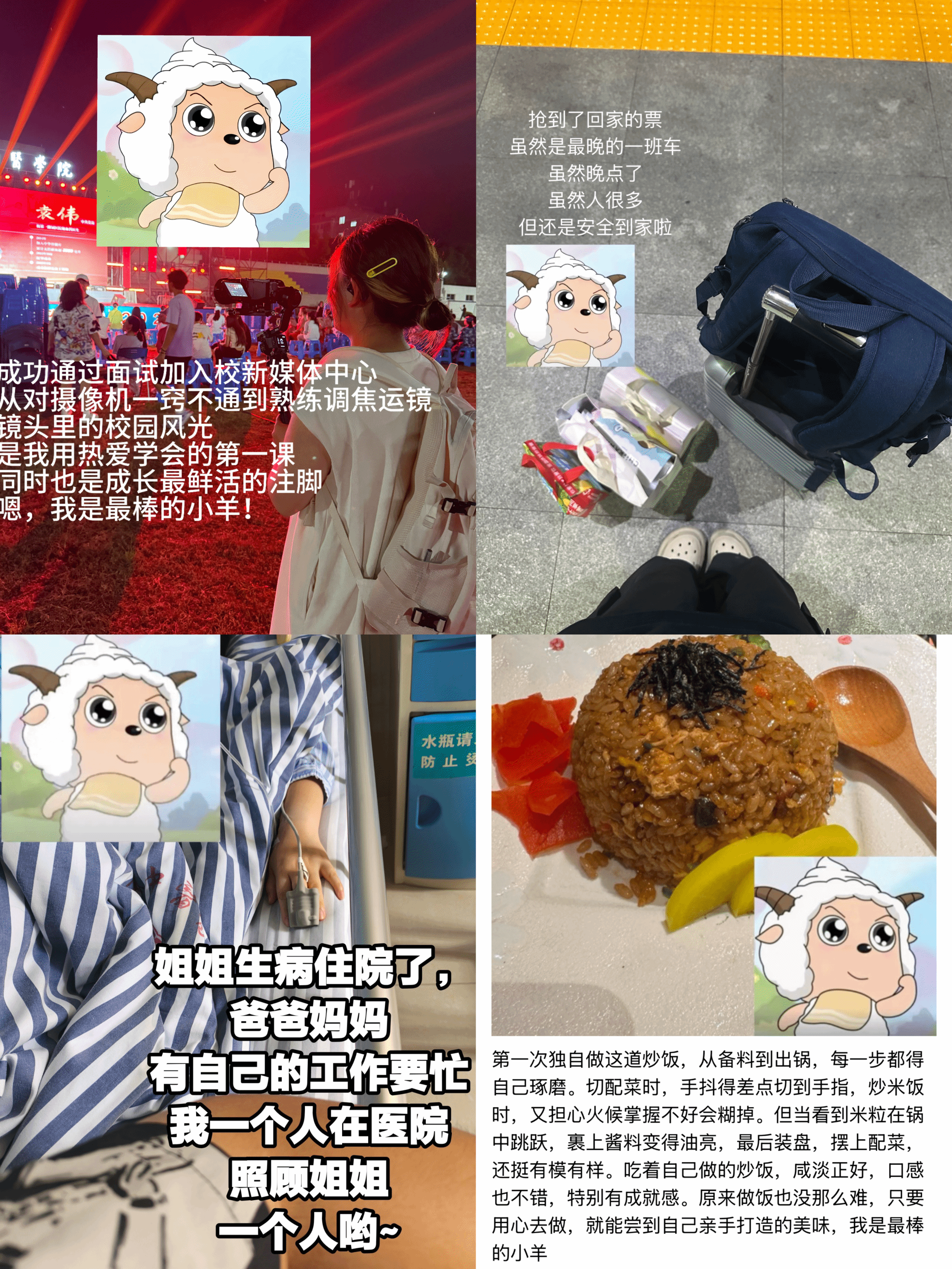 为了鼓励学生记录和分享大学期间从依赖走向独立的成长历程,人文与管理学院于9月26日至10月2日面向全院学生开展“小羊成长记·我的独立图鉴”图文征集活动,活动旨在记录同学们离开家乡、开启大学生活后的成长历程,包括独立适应校园生活、独自就医、参与志愿服务、投身科技项目等多方面经历。这些点点滴滴的成长印记,如同一只只小羊离开母羊庇护、逐渐独立的过程,展现了当代大学生在陌生环境中勇敢前行的精神风貌。