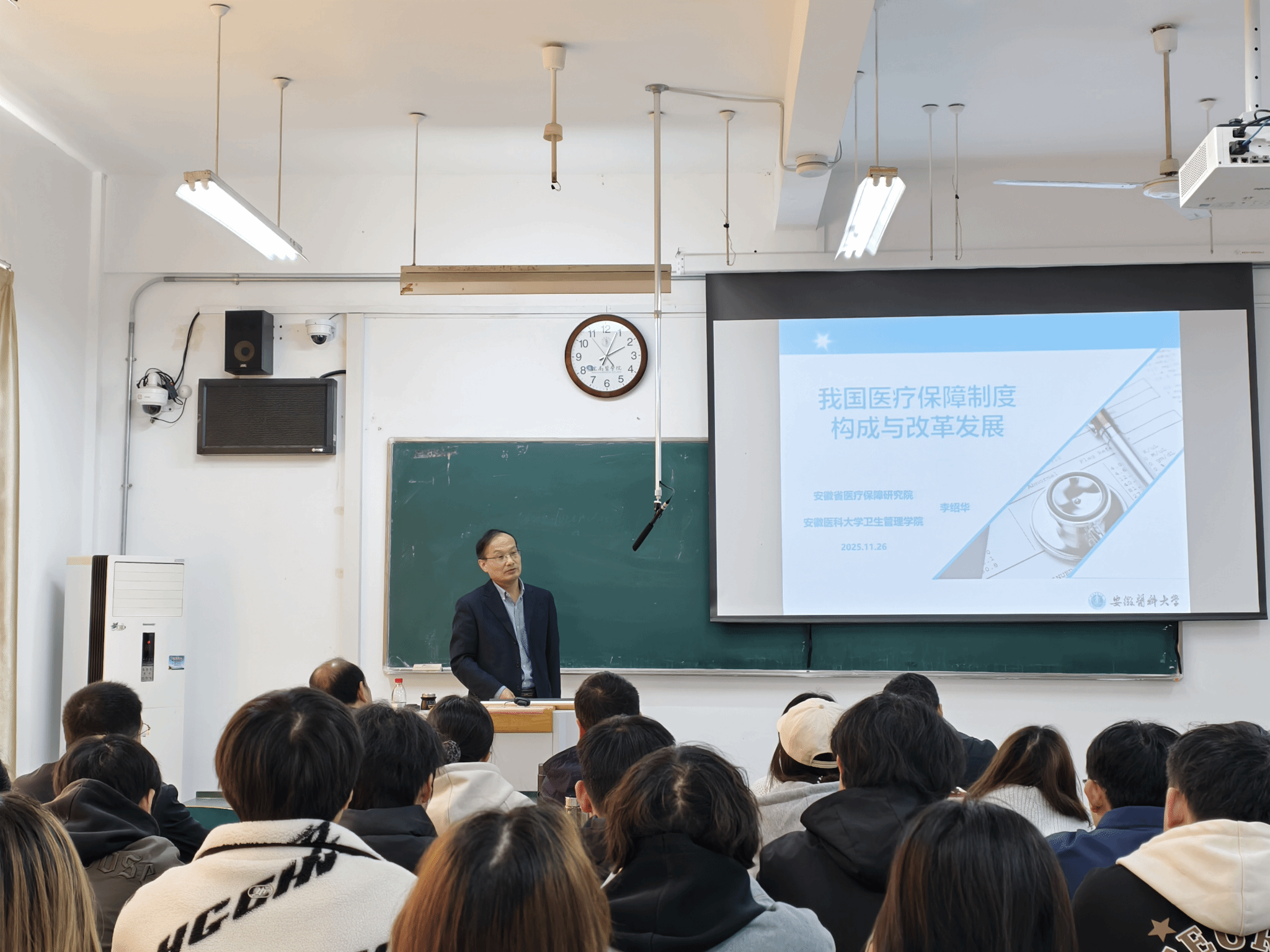 2025年11月26日下午,安徽省医疗保障研究院常务副院长、中国医疗保险研究会支付改革专委会副主任委员李绍华教授应邀来我校,围绕“我国医疗保障制度的构成与改革发展”作专题学术报告。报告会由人文与管理学院院长王国平主持,医疗保险教研室全体教师及2024级医疗保险专业全体学生到场聆听。