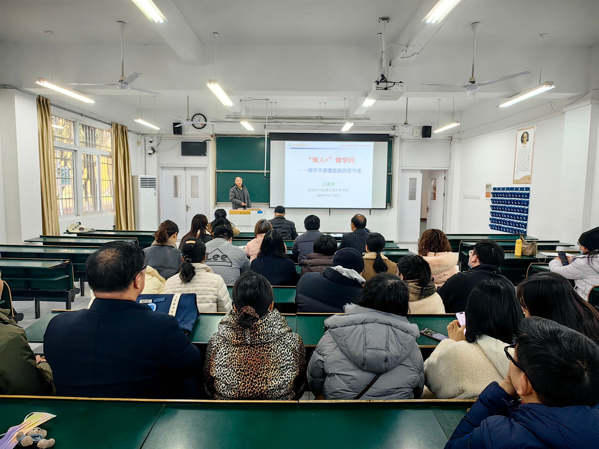校教学督导组组长汪萌芽教授以《“做人+”做学问——做学术道德底线的坚守者》为主题,作了一场兼具思想深度与实践指引的学术道德专题报告。报告以“学术道德与学风建设”为核心脉络展开,以中国科学院院士邹承鲁的治学与奉献事迹切入:既介绍了邹承鲁自上世纪八十年代起为国家科技政策建言献策、推动我国科学事业健康发展所作的突出贡献,更援引其《我的科学之路》中“努力追求科学真理,避免追求新闻价值,跟踪最新发展前沿,不断提高水平,勤奋工作,永不自满”的治学准则,生动诠释了“做人的底色”是“做学问的根基”这一核心逻辑。 随后,汪萌芽系统梳理了学术道德的制度体系与典型案例:从2018年《教育部关于高校教师师德失范行为处理的指导意见》、2019年《学术出版规范——期刊学术不端行为界定》等政策文件,到中国科学院、国家自然科学基金委发起的学风建设倡议,清晰呈现了学术规范的历史性框架;同时结合学术不端反面案例,以“警示性样本”提醒广大教师:学术诚信是科研与治学的生命线,需时刻以道德底线约束自身行为。