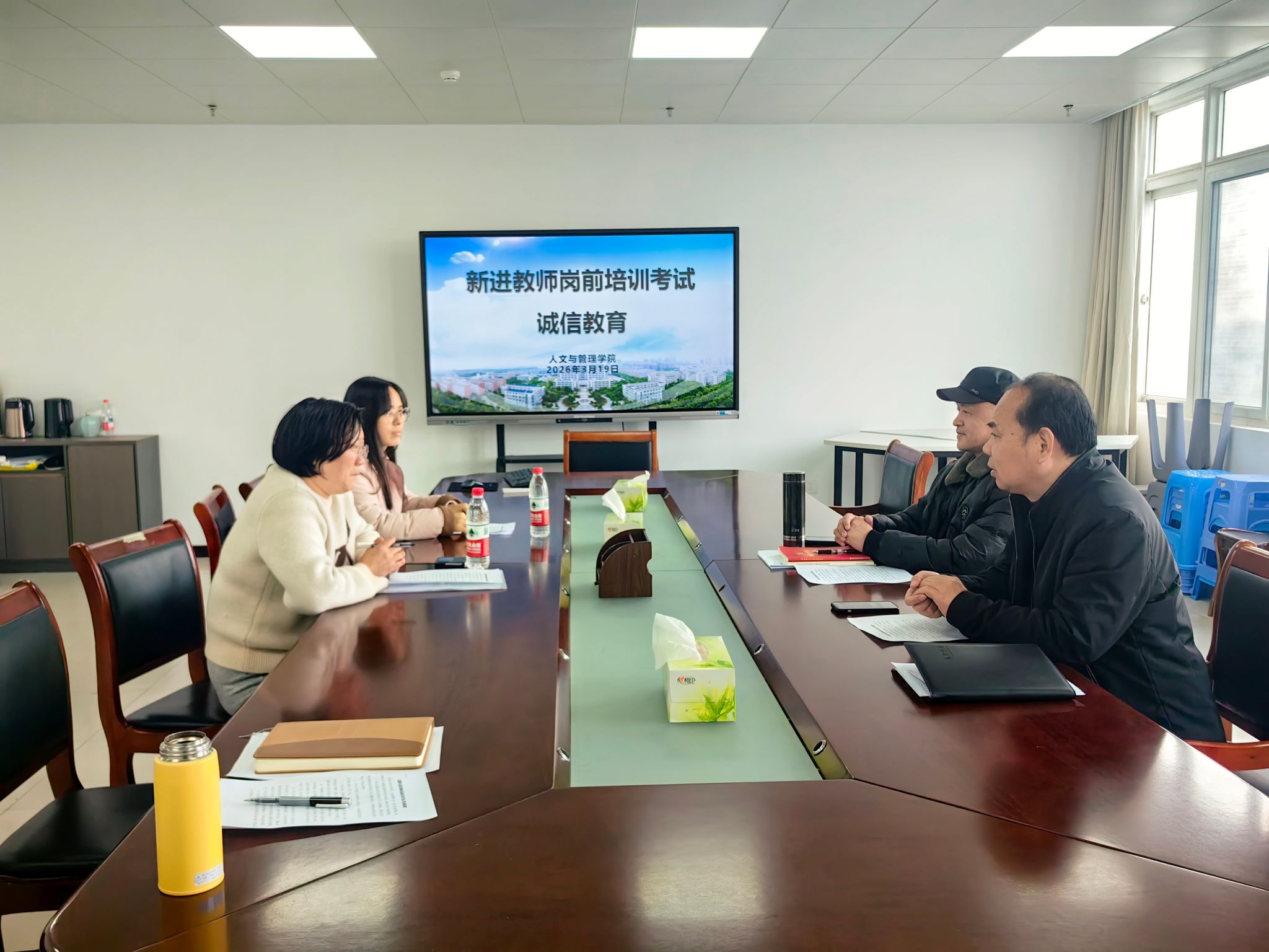为加强师德师风建设,强化新进教师诚信应考意识,3月19日,人文与管理学院组织李露、赵婷两位教师开展岗前培训结业考试诚信教育。学院党委书记王军、院长王国平主讲,为参考教师筑牢诚信应考思想防线。