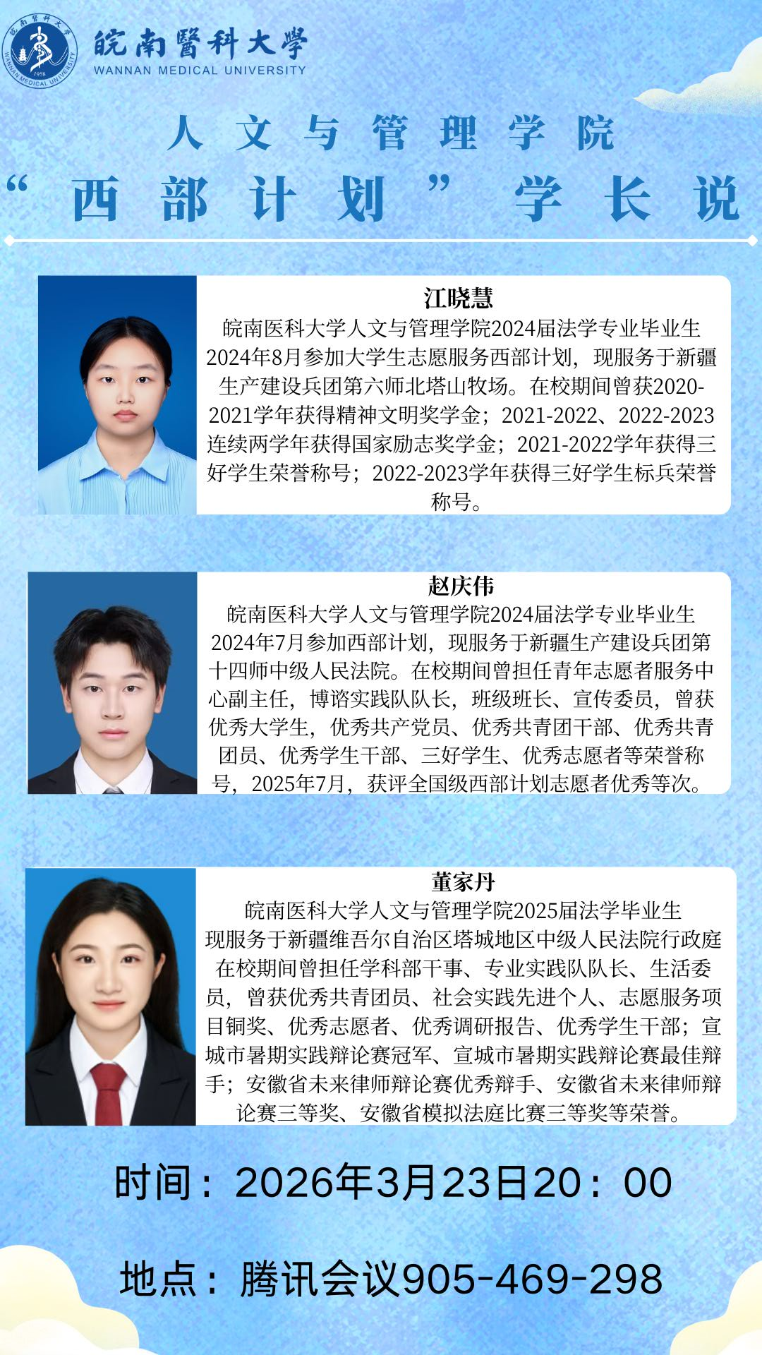 为深入宣传大学生志愿服务西部计划,引导青年学子将个人理想融入国家发展大局,3月23日,人文与管理学院通过腾讯会议举办“西部计划”学长说线上分享会,邀请四位投身西部建设的优秀毕业生担任嘉宾,分享基层服务经历与成长感悟。