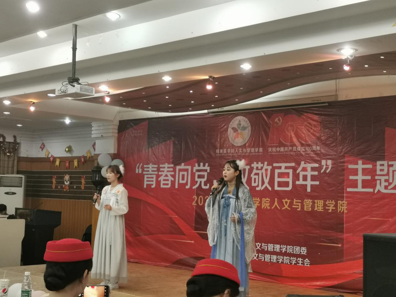 为庆祝中国共产党成立100周年,营造全面深入开展党史学习教育的浓厚氛围,展现我们党矢志践行初心使命、筚路蓝缕奠基立业、创造辉煌开辟未来的百年征程,2021年 5 月 14日晚7点,人文与管理学院于赭麓校区四号教学楼七楼报告厅举办“青春向党,致敬百年”主题晚会。人文与管理学院党委书记窦弘、院长胡鸿、护理学院团委书记范绮慧、各年级团总支书记应邀与师生共赏晚会,晚会现场座无虚席,热闹非凡。