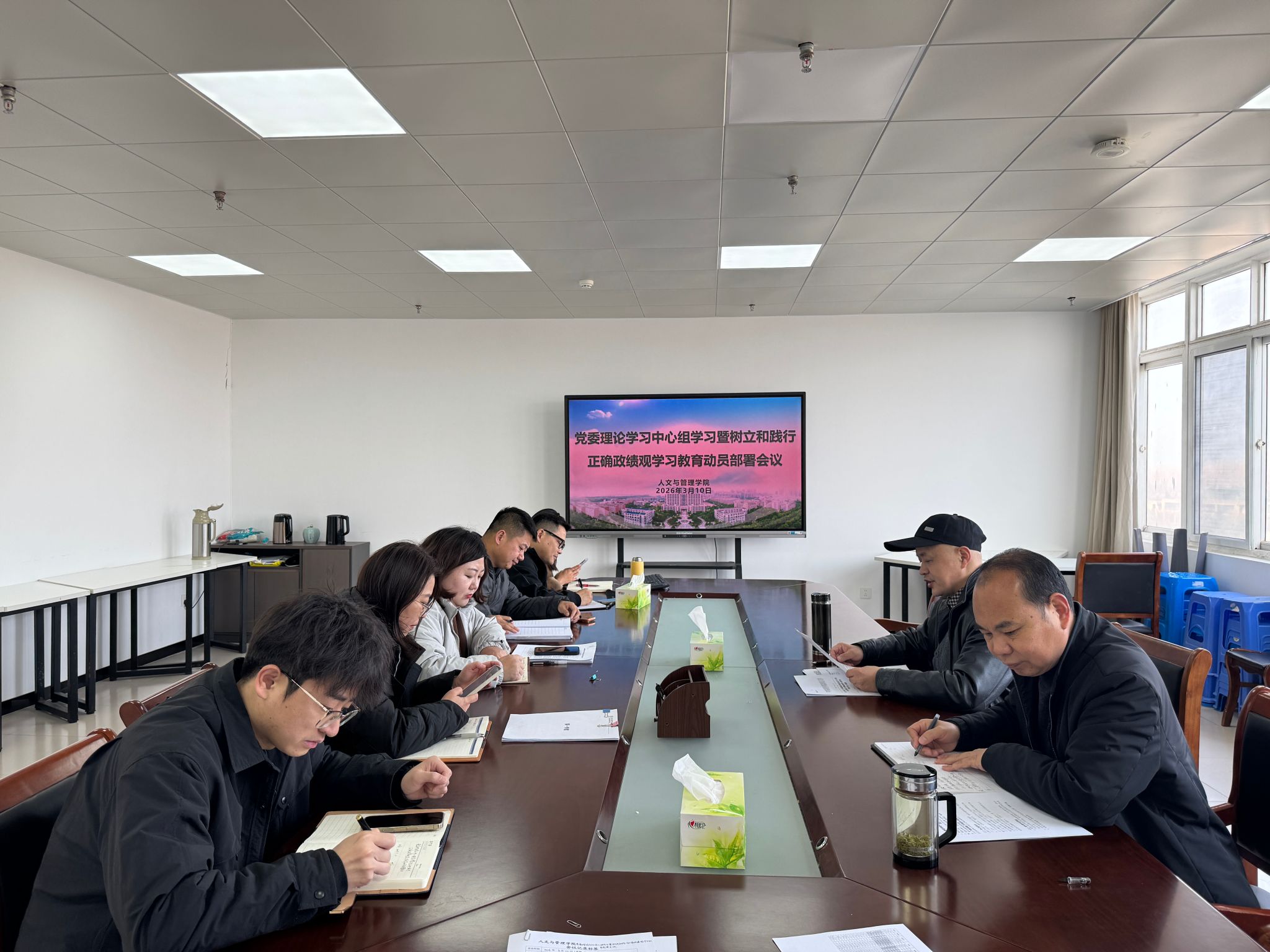 3月10日上午,人文与管理学院召开党委理论学习中心组学习会议,全面启动并部署树立和践行正确政绩观学习教育。学院党委书记王军主持会议,全体党委委员、各党支部书记参加会议。