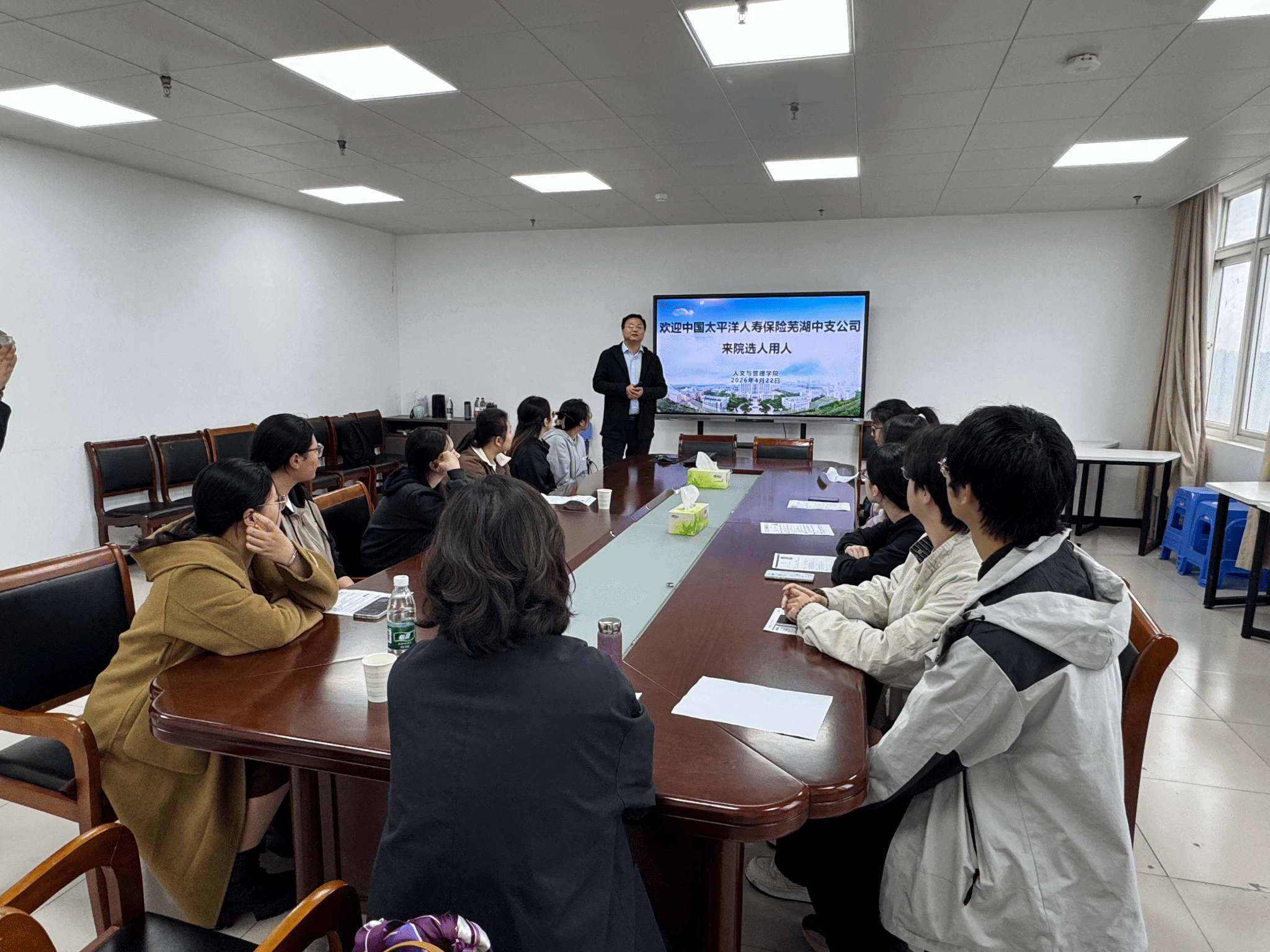 4月22日,中国太平洋人寿保险股份有限公司芜湖中支公司来院开展专场招聘,我院近20名毕业生到场参与求职交流。